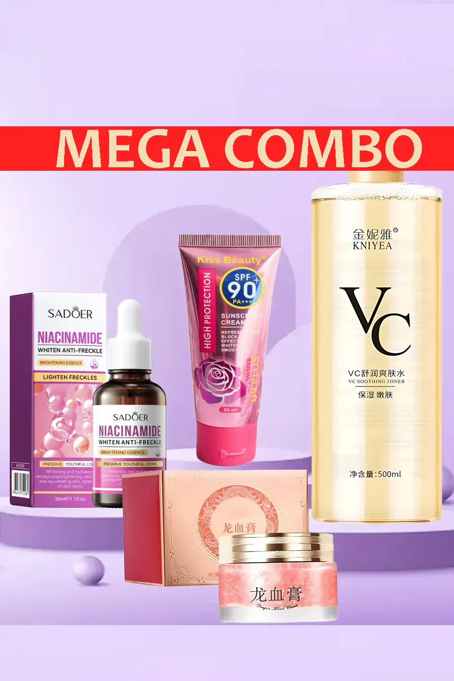 Elevate your daily skincare routine with this ultimate 4-in-1 facial care combo, combining the brightening power of Kniyea VC Toner, the skin-perfecting benefits of Sadoer Niacinamide Essence, the advanced UV protection of Kiss Beauty Sunscreen, and the deep rejuvenation of Retinol Placenta Royal Dragon Blood Cream. Each product is designed to nourish, protect, and transform your skin — giving you a radiant, hydrated, and youthful complexion every day.